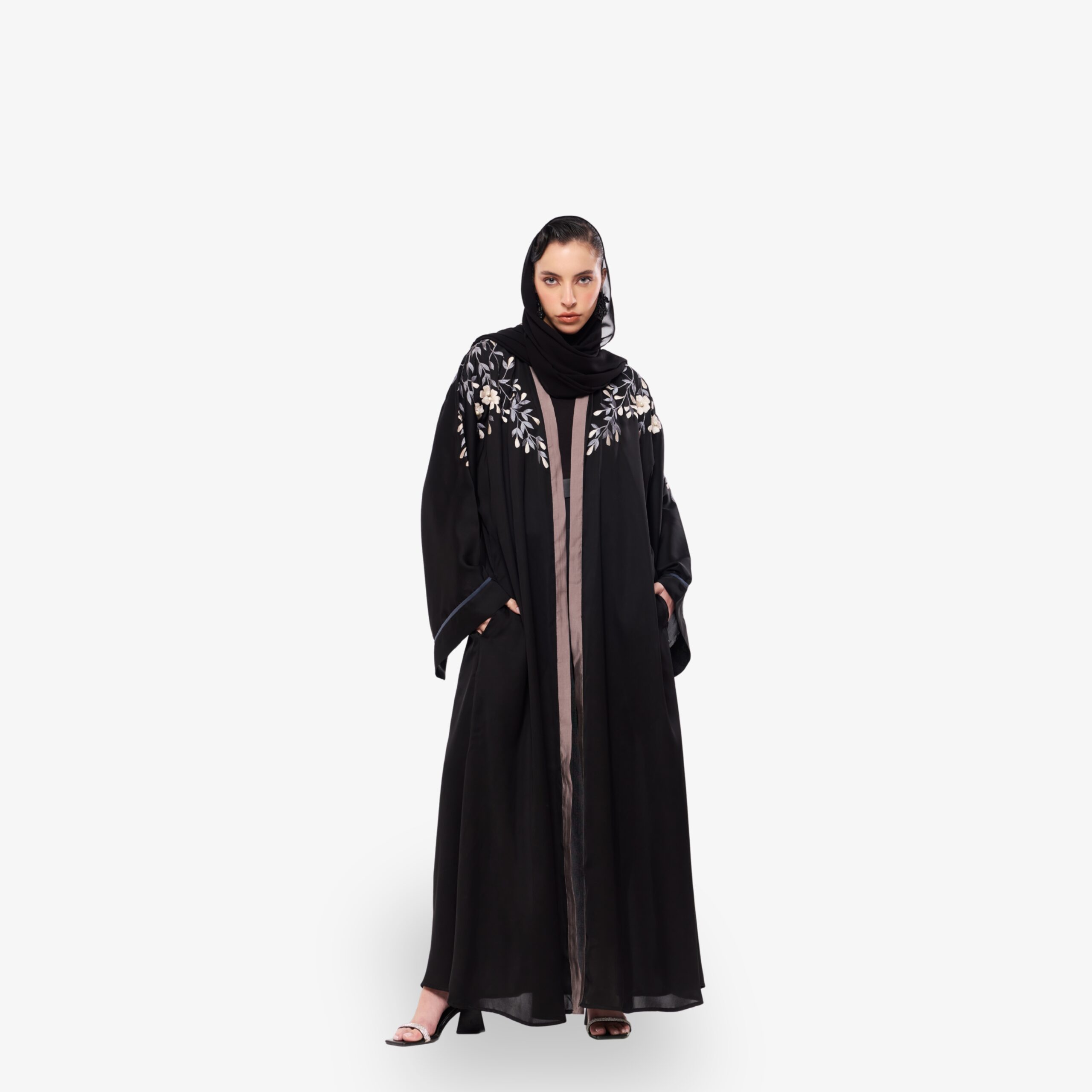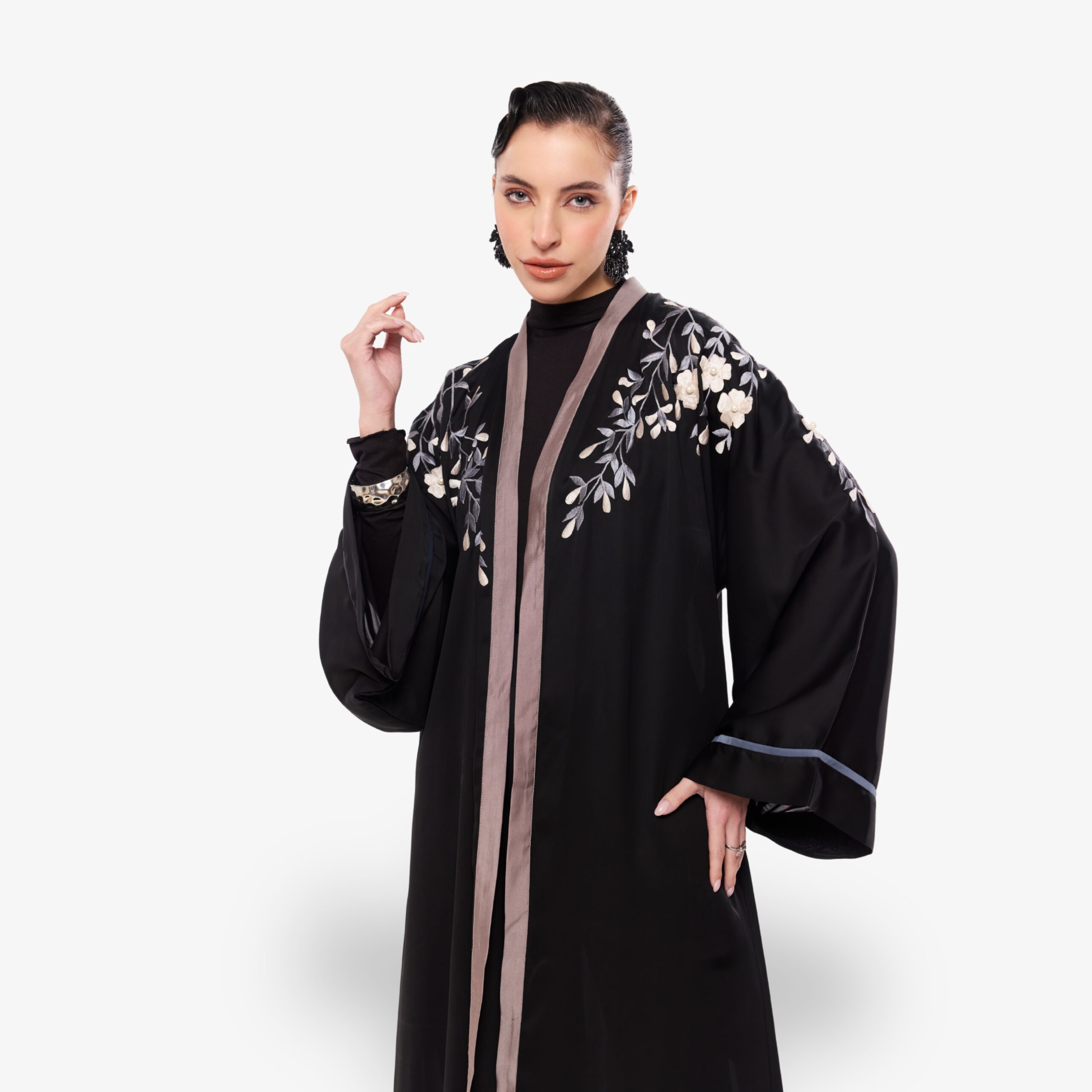 Crafted in fluid Como satin, this Nero abaya blends modern refinement with a timeless, understated allure. Intricate thread embroidery adorns the shoulders and gracefully traces its way along the front and back, creating a seamless tapestry of artistry and movement. The fabric’s gentle sheen adds a quiet luminosity, elevating the silhouette with every shift of light.