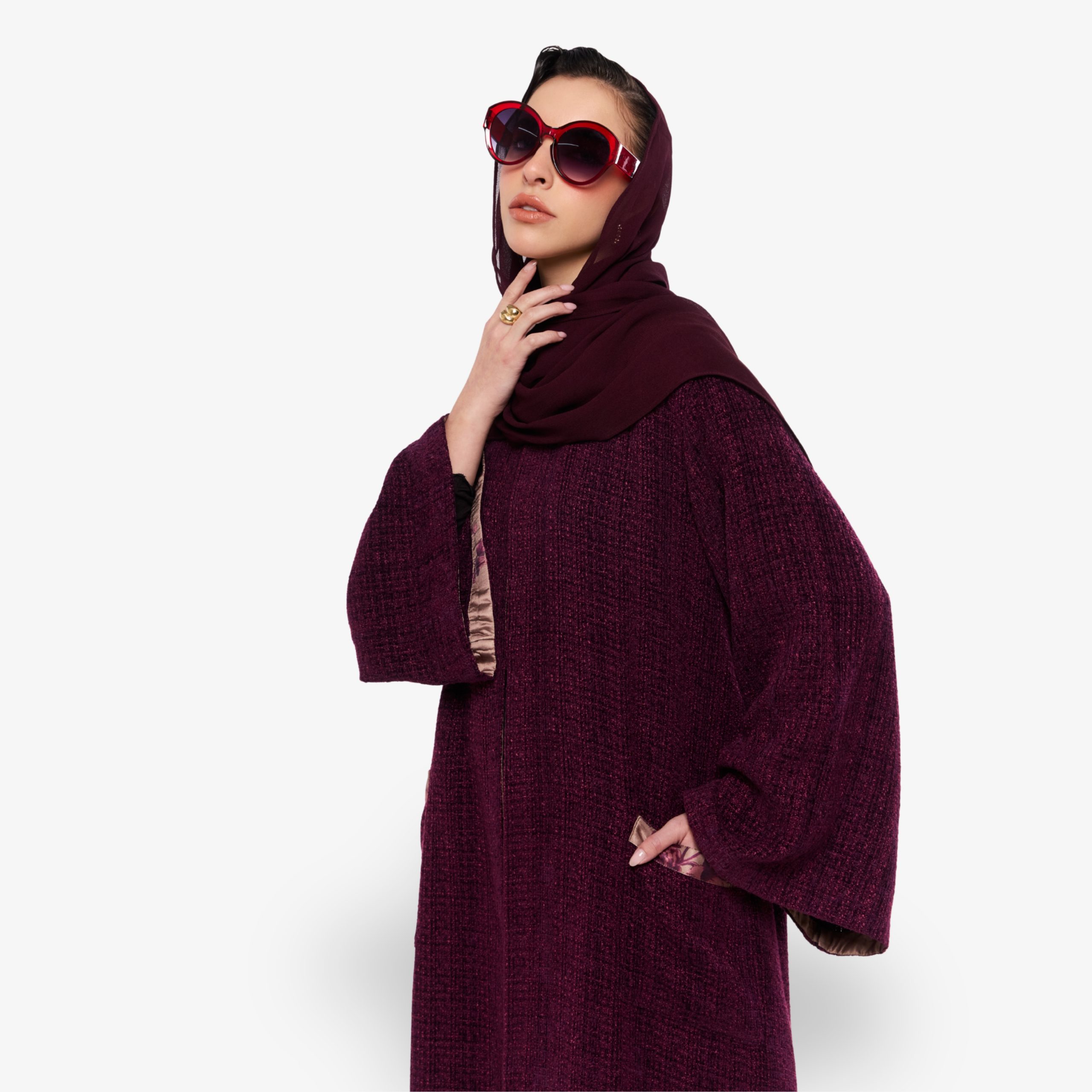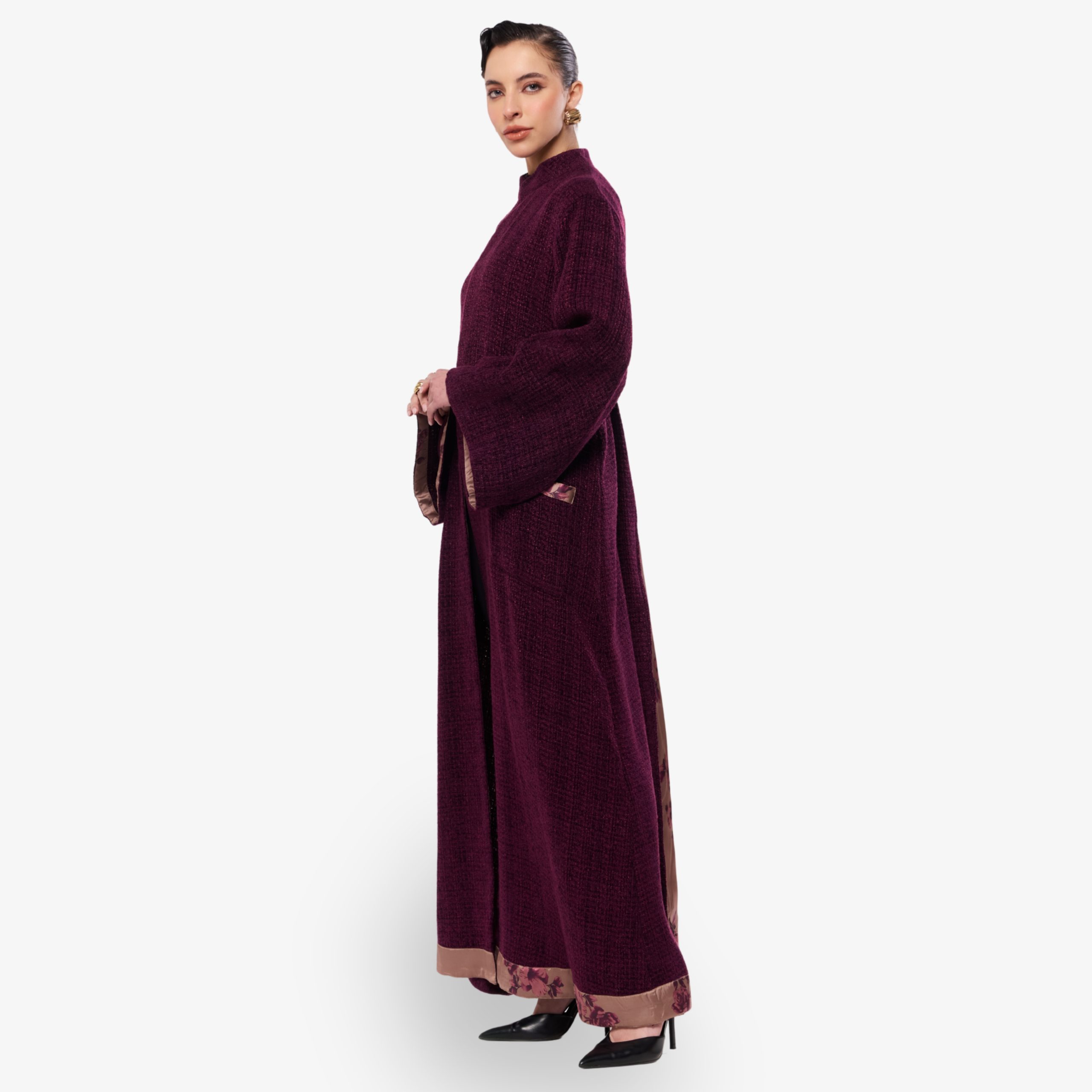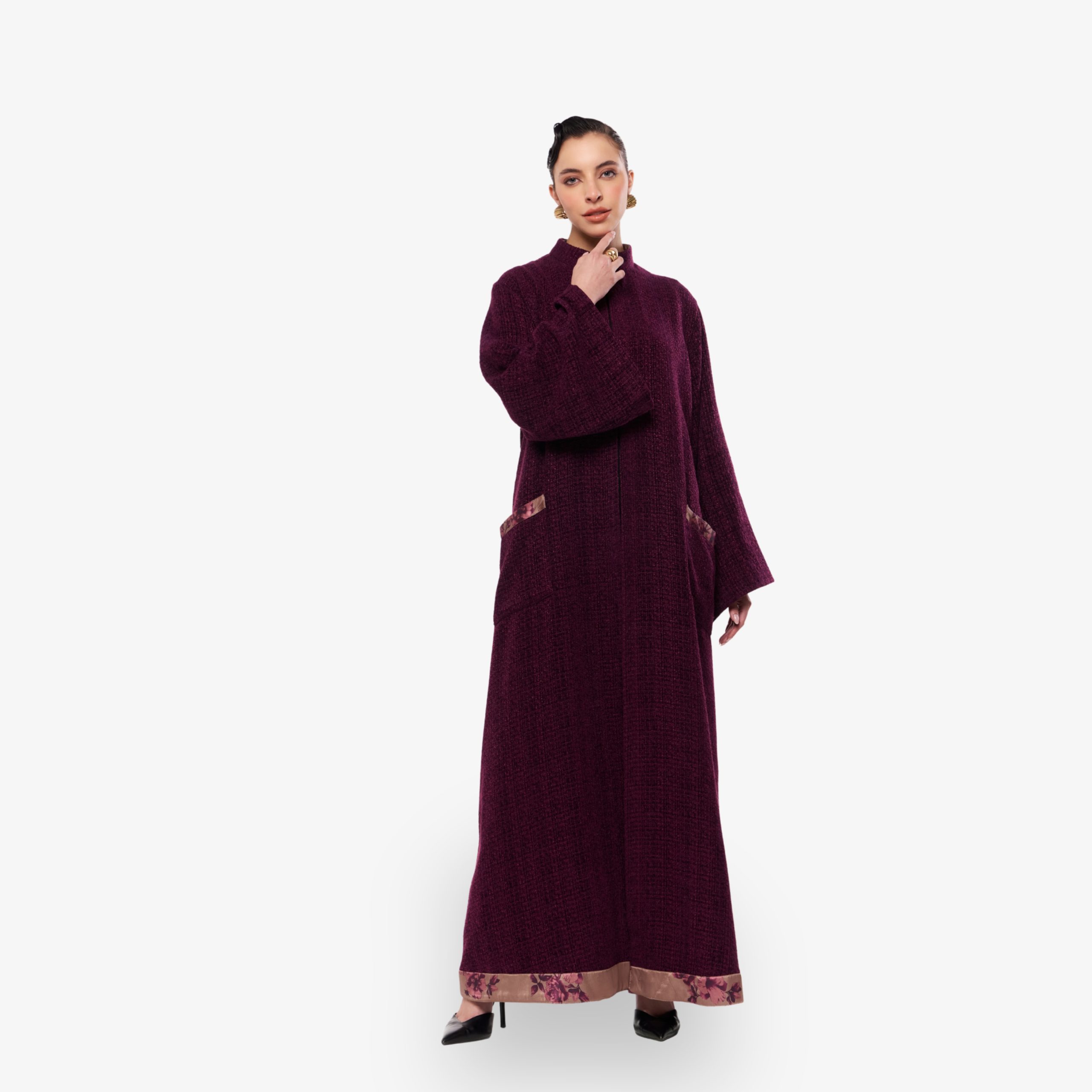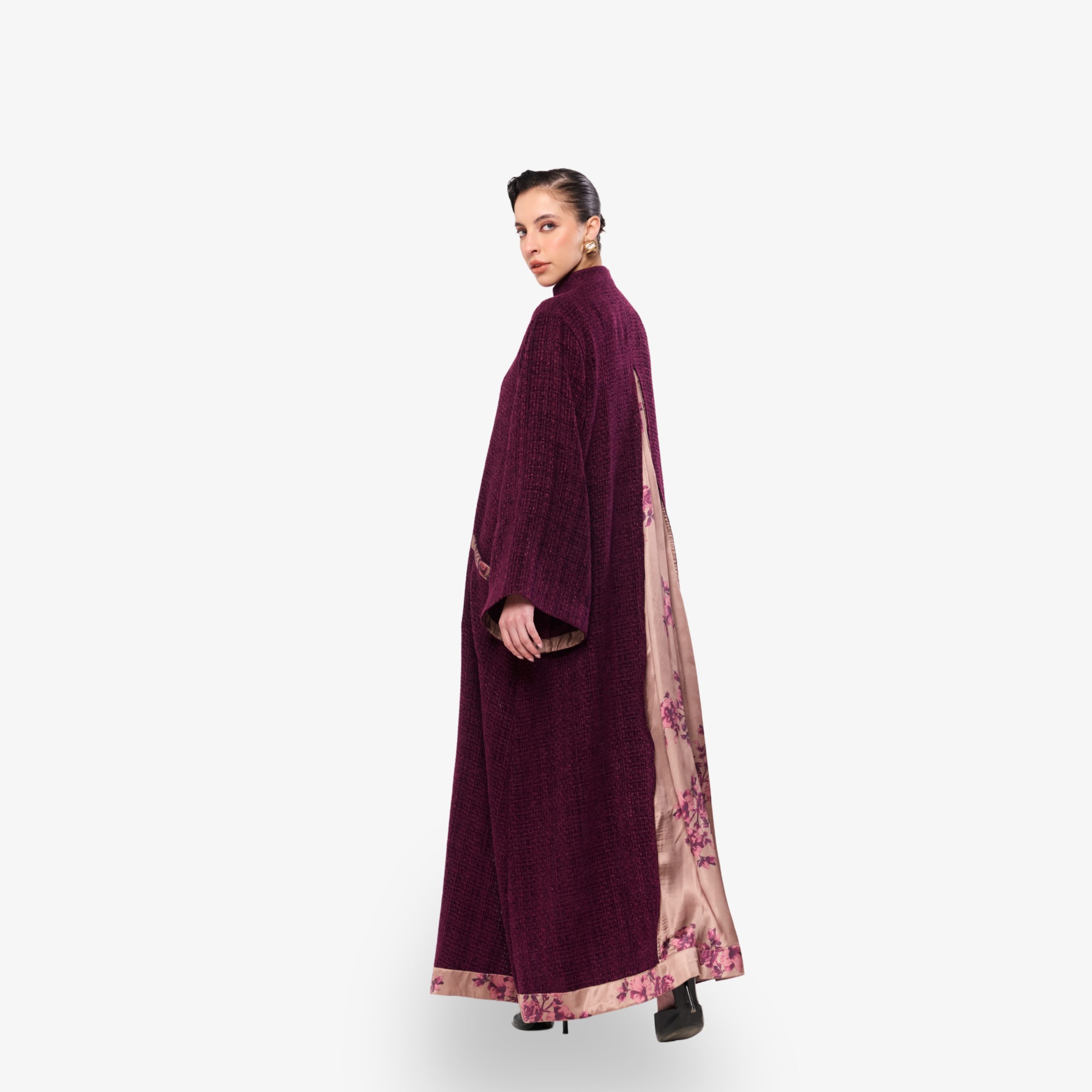 Crafted from textured bouclé cotton, this abaya offers a cozy yet elevated take on everyday elegance. The silhouette drapes softly, while a playful printed lining adds an unexpected touch of character with each movement. A statement hem frames the design with refined contrast, enhancing its relaxed yet polished appeal.